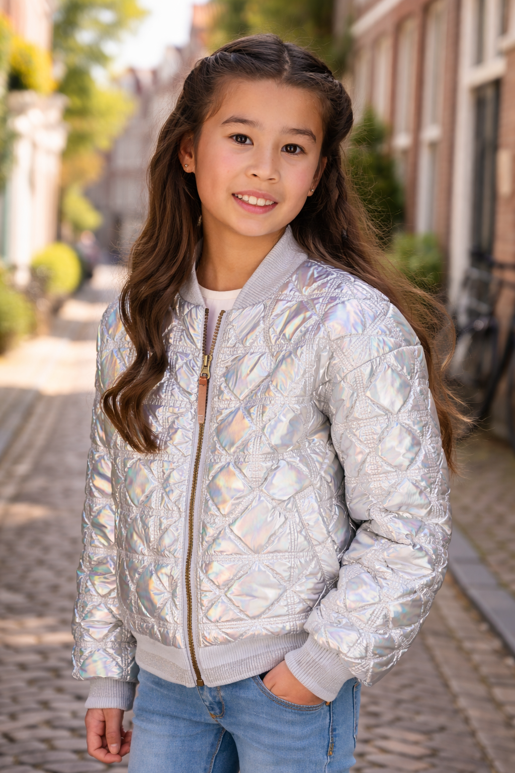 Je maakt de blits met dit zilveren holografische gestepte bomberjasje . De fijne tricot boorden hebben een passende zilverkleurige streep.